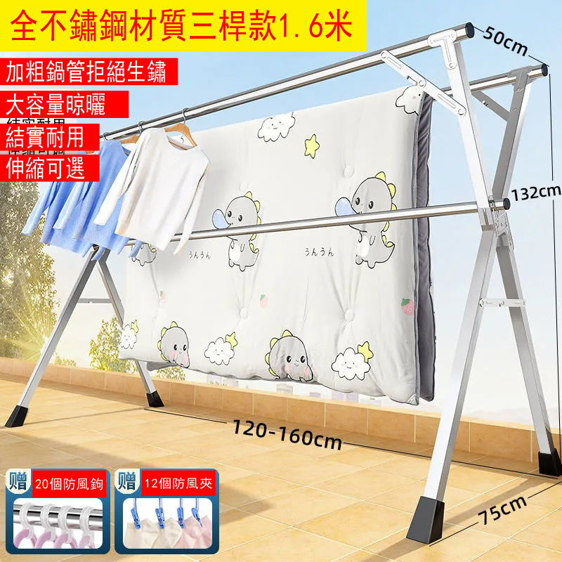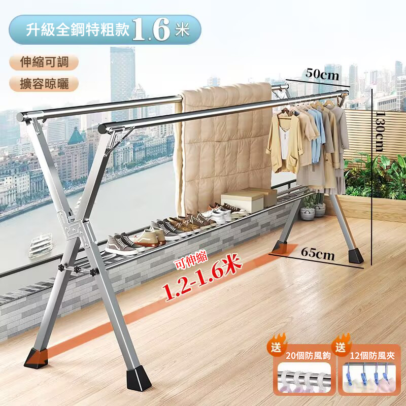 11分鐘前【下單即送20個防風掛鉤】不鏽鋼免安裝折疊家用伸縮式晾衣架 - 2025升級鞋架款1.6米 【可伸縮-送20個防風鉤+12個防風夾】NT$1890