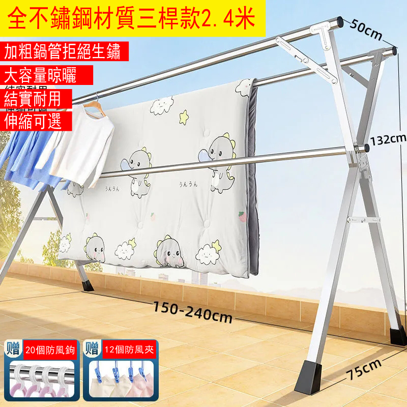 7分鐘前【下單即送20個防風掛鉤】不鏽鋼免安裝折疊家用伸縮式晾衣架 - 2025升級鞋架款2.4米 【可伸縮-送20個防風鉤+12個防風夾】NT$2090