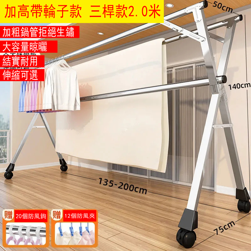 20分鐘前【下單即送20個防風掛鉤】不鏽鋼免安裝折疊家用伸縮式晾衣架 - 2025升級款加萬向輪2.0米【可伸縮-送20個防風鉤+12個防風夾】 NT$1890