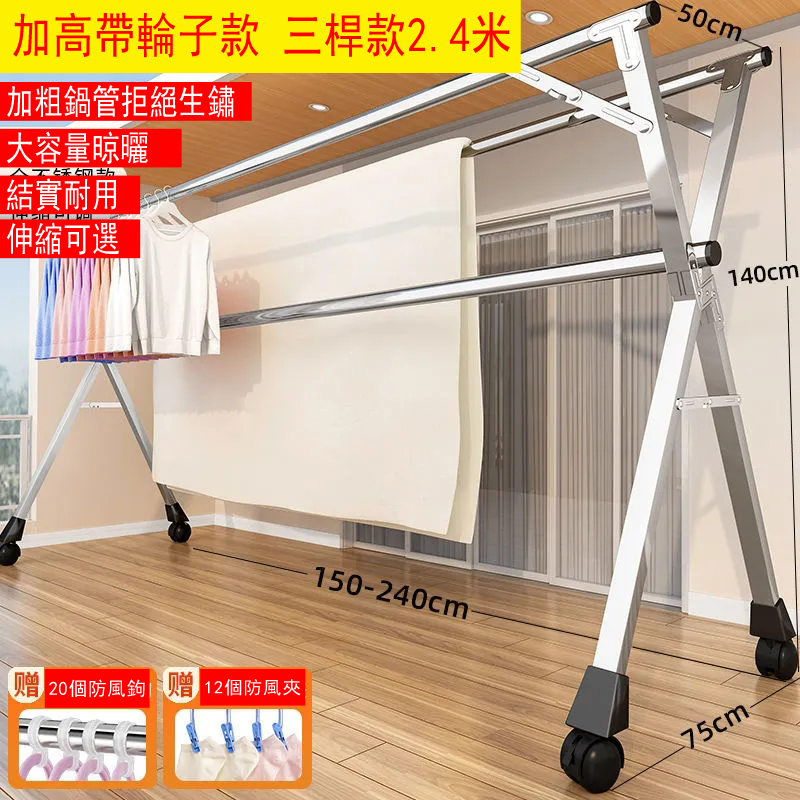 4分鐘前【下單即送20個防風掛鉤】不鏽鋼免安裝折疊家用伸縮式晾衣架 - 2025升級款加萬向輪2.4米【可伸縮-送20個防風鉤+12個防風夾】 NT$1990