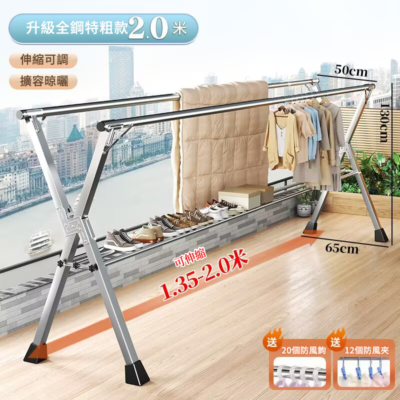 11分鐘前【下單即送20個防風掛鉤】不鏽鋼免安裝折疊家用伸縮式晾衣架 - 2025升級鞋架款2.0米 【可伸縮-送20個防風鉤+12個防風夾】NT$1990