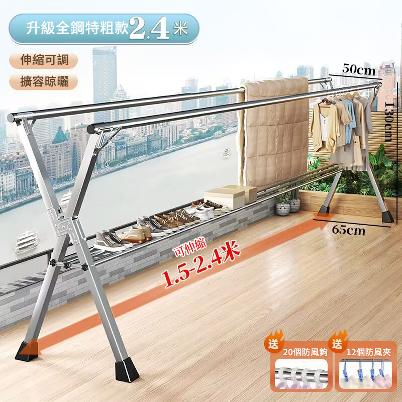 2分鐘前【下單即送20個防風掛鉤】不鏽鋼免安裝折疊家用伸縮式晾衣架 - 2025升級鞋架款2.4米 【可伸縮-送20個防風鉤+12個防風夾】NT$2090