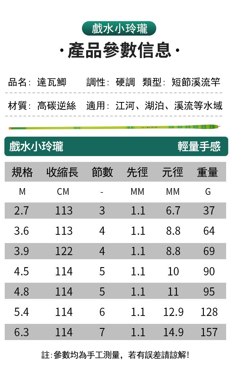 2分鐘前【新上市 買一送一】小玲瓏魚竿,37調綠竹魚竿 超細青竹釣手竿 - (買一送一)21尺(6.3m)+15尺(4.5m)+竿梢 NT$1790