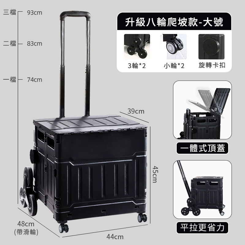 半小時前【折疊購物車】買菜購物免提重,爬樓搬運超省力!大容量好收納,露營野餐隨拉隨走,居家外出都好用! - 【八輪爬坡款(大號)】 加厚帶蓋 黑色 NT$2390