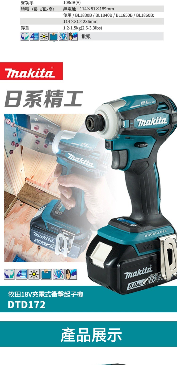12分鐘前【特價200組】MAKITA 牧田18V鋰電無刷衝擊起子機 強勁動力 不滿意包退換 - DTD172【1電1充+塑箱+鑽頭配備】--NT$2180